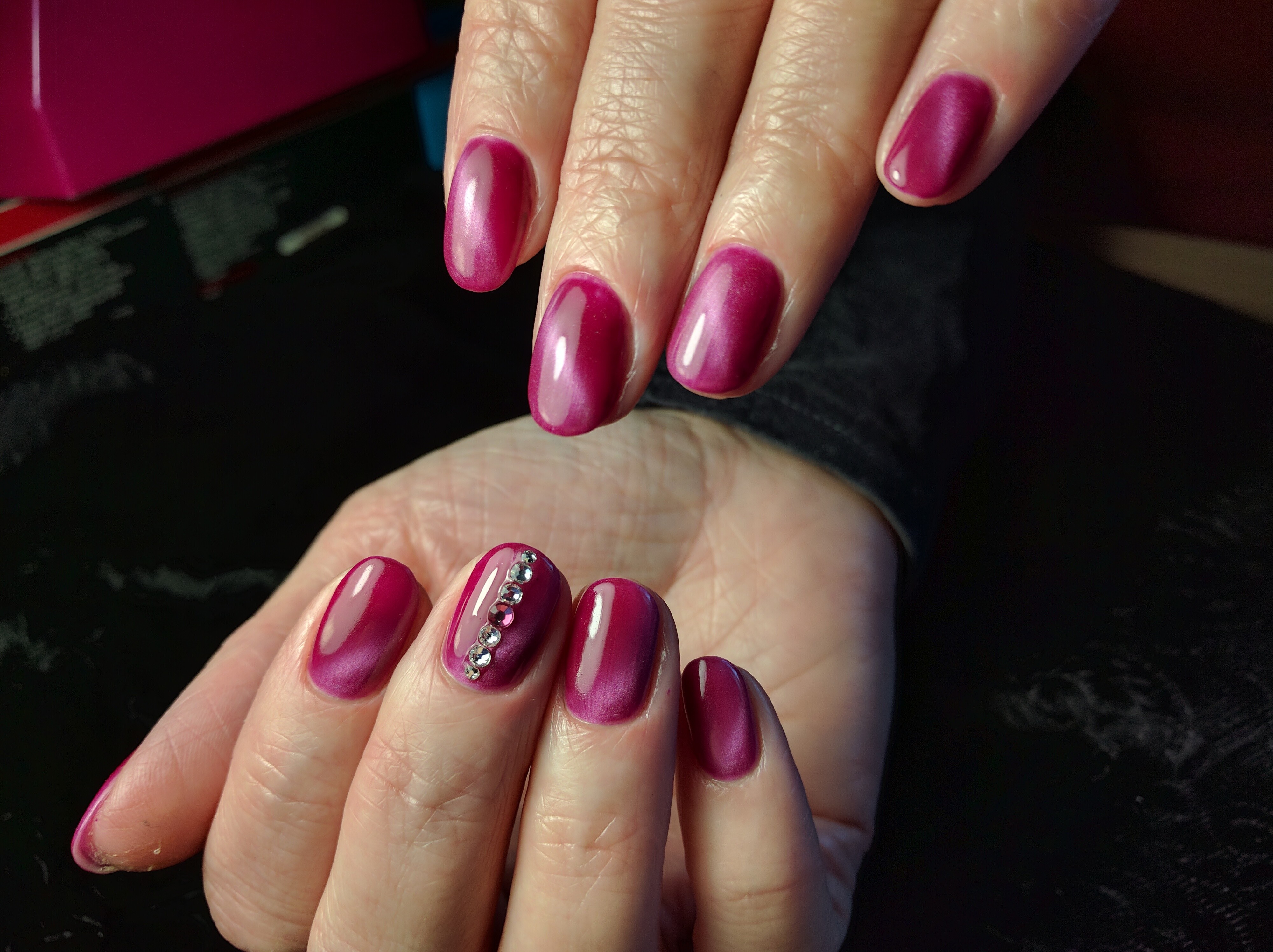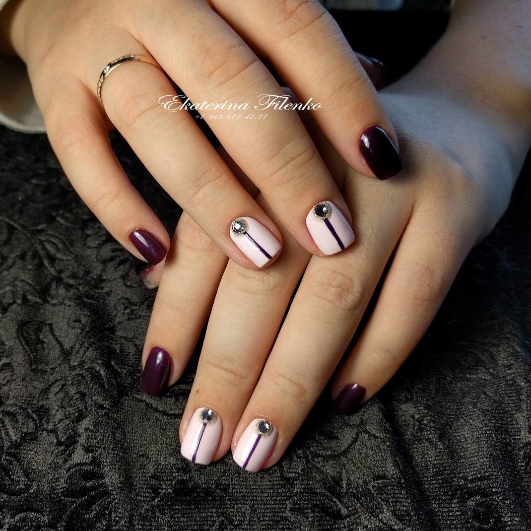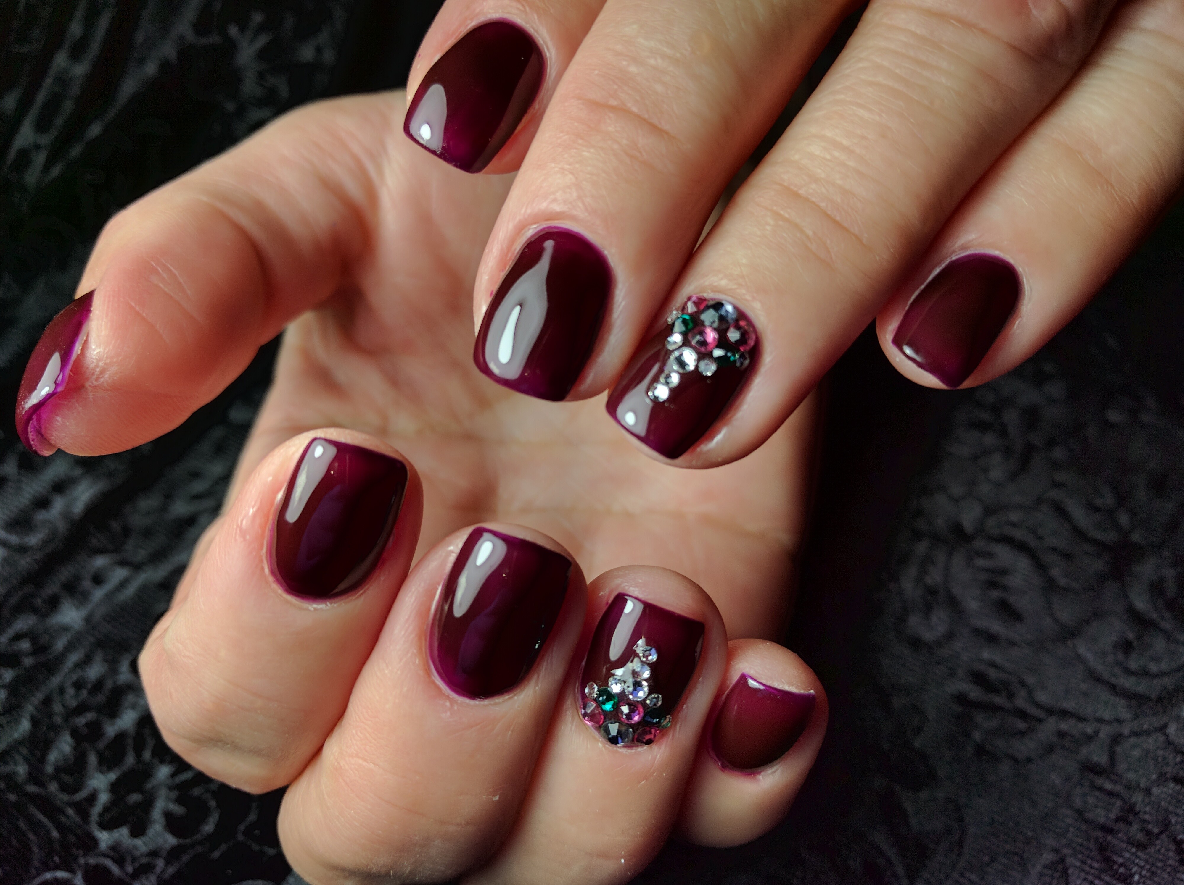 Собиралась я как-то летом на свадьбу друзей и пошла в салон у дома на маникюр. Выбрала красивый глубокий цвет, безымянные пальцы решила украсить стразами, спросив у мастера,сделает ли красивую инкрустрацию. Сделала. 3 стразинки у основания о и смешно и грустно одновременно... После этого я несколько раз ходила к Кате, перебирала её образцы и наконец-то решилась на стразы. Катя сделала красивую инкрустрацию, в которой кто-то видит корону, кто-то Эйфелевую башню. Стразы переливаются просто нереально! За капронки не цепляются (чего я так боялась), все камни на месте, благодарю за эффектный маникюр!